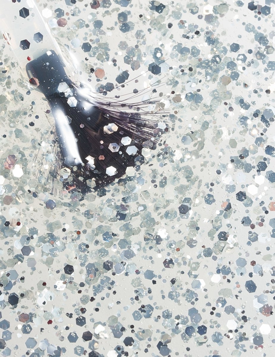 Neskutečný Lesk: Čirý gelový topcoat s luxusními stříbrnými třpytkami různých velikostí.